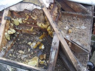 A late post just to document a cut out I did in South Leeds on the the 30th April 2011. My bee keeping association took a call from a roofer stating work had stopped due to a bee colony in a roof. All the roof slates had been removed and the new sheeting had been installed apart from this one corner where the slates had come off but the felting was still in place. I think it had took them a couple of days to ring us and the colony was very docile, may be from the very cold nights (they were still hitting freezing). This is the space that was left once all the comb was removed. It was a good sized colony.